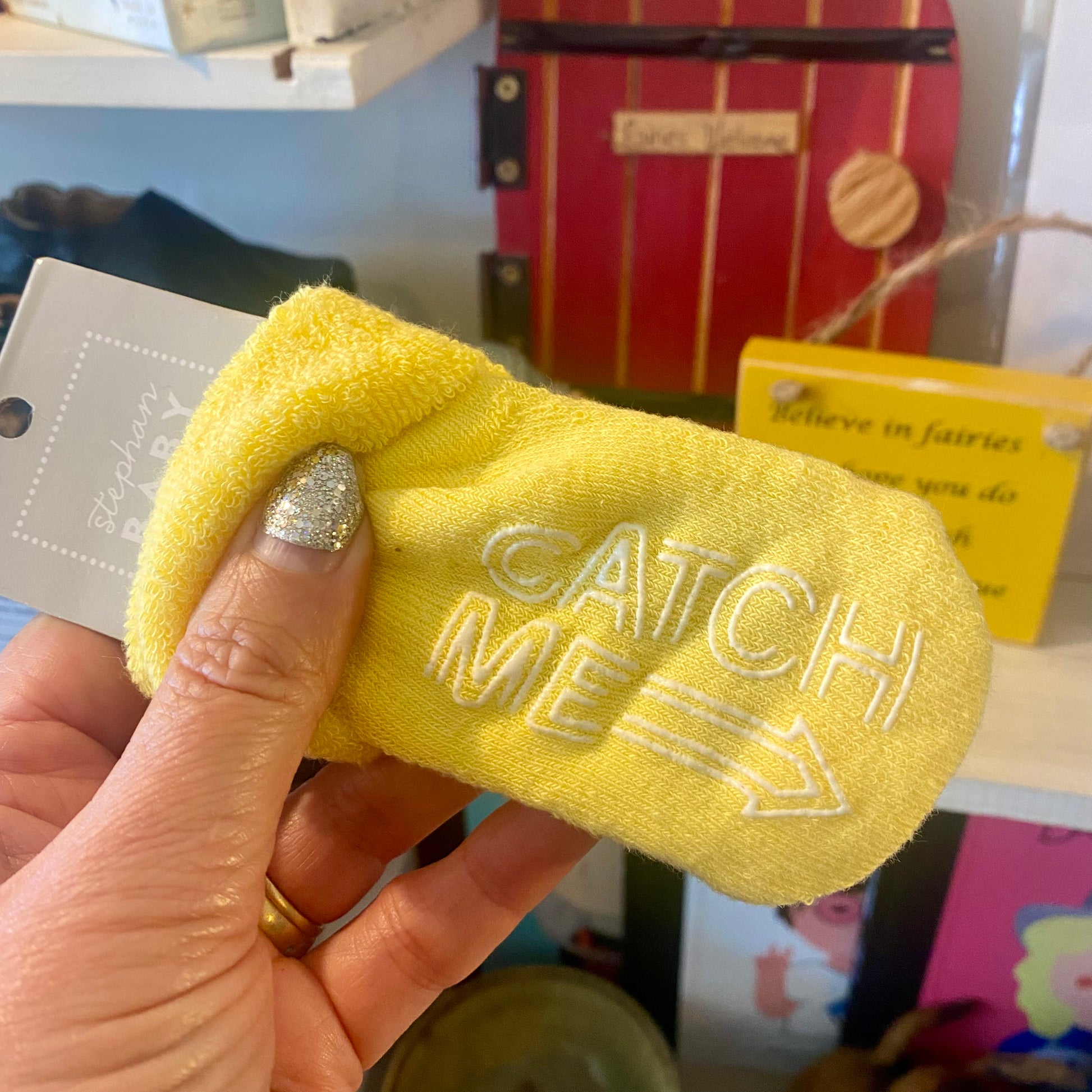 From the Fun+Games Silly Socks collection, these darling pairs of sock feature non-slip phrases on the bottom, they are cotton on the outside and terry on the inside and make a wonderful gift for a new baby!