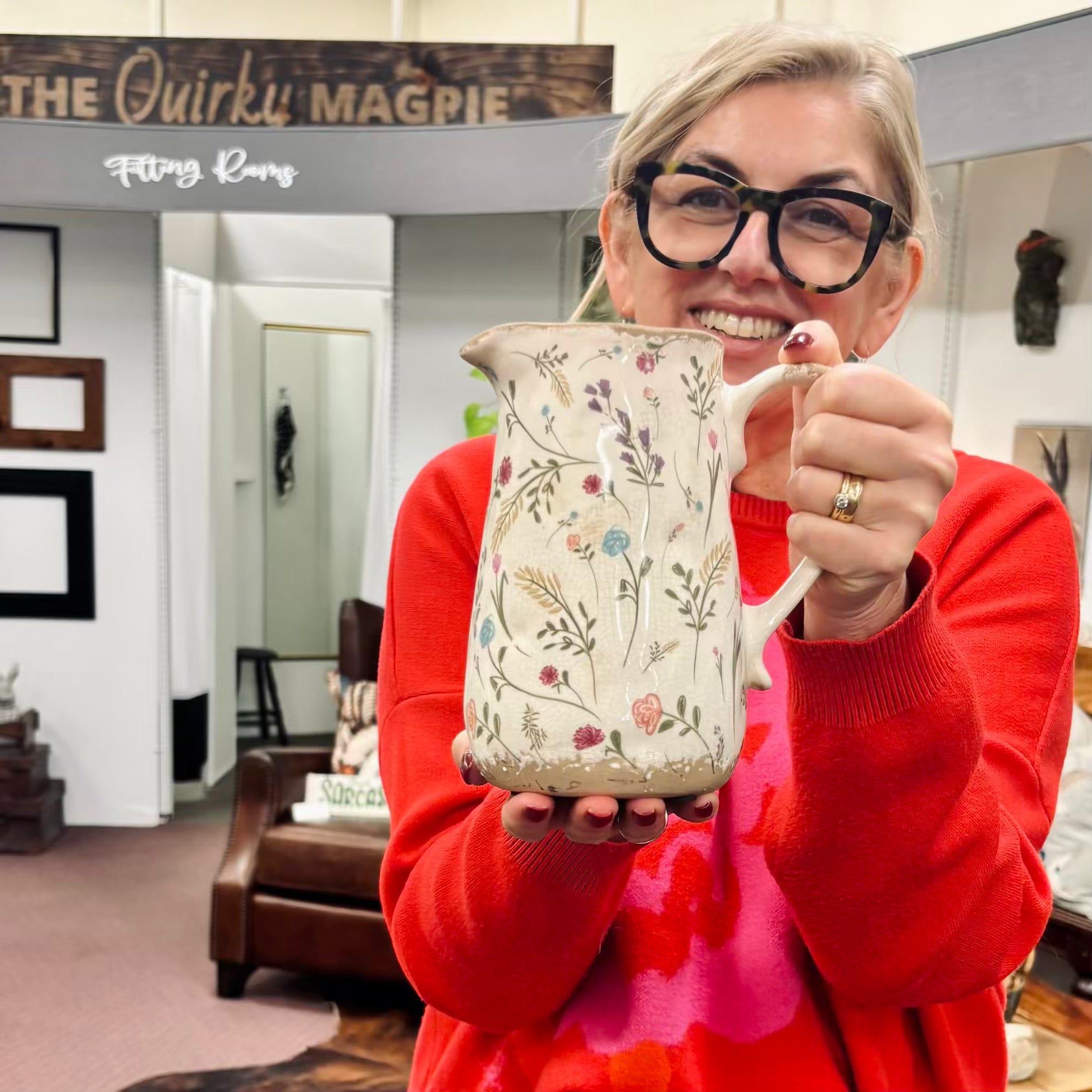 Enhance your living space with the Flower Pitcher Vase, a softly shaped piece that radiates rustic elegance.