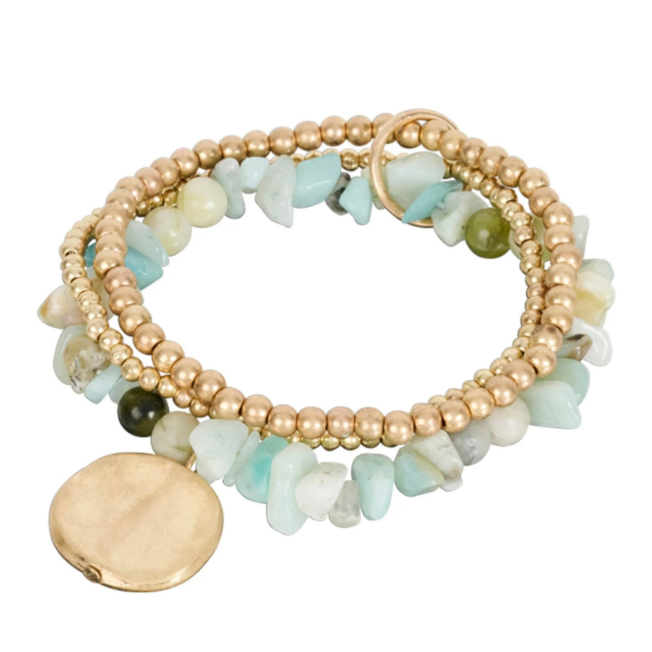 This collection features cool-toned natural stones and beaded strands, elegantly connected by a golden hoop detail.