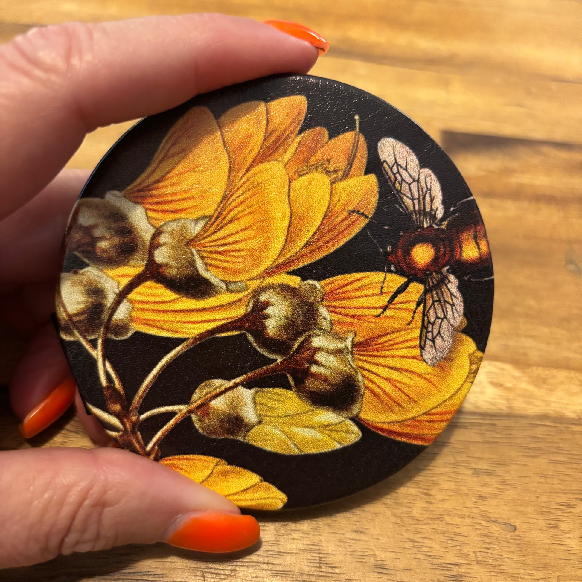 The sleek, matte black metal casing has a hinged lid featuring a beautiful botanical print, while the inside boasts a regular mirror and a double magnifying mirror.